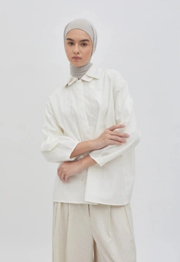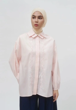 A relaxed embroidered shirt with a pointed collar and front panel detailing. Crafted from lightweight polyester with a soft sheen. Features subtle texture work that adds depth while keeping the silhouette classic.