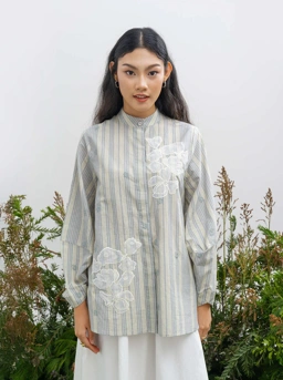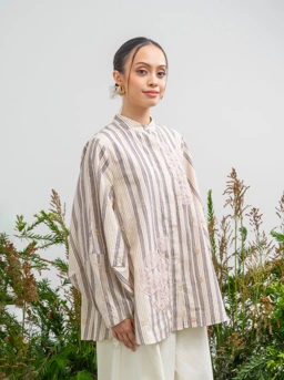 Kemeja stripes hadir spesial dengan aksen sheer floral, dalam bahan katun bordir yang nyaman untuk hari Raya.