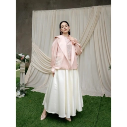 Jaketan cropped dengan potongan longgar atau sedikit kotak, jatuh hingga pinggang. Terbuat dari bahan yang tampak agak kaku atau berstruktur, kemungkinan satin duchess, yang menciptakan bentuk yang skulptural.
