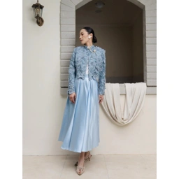 Rok Karen memiliki siluet A-line yang mengalir dengan detail plisket di bagian pinggang, menciptakan volume yang indah dan gerakan dinamis saat berjalan. Rok ini terbuat dari kain satin dan memiliki jatuhan yang anggun.