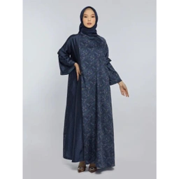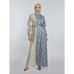Dress dengan potongan raglan yang terbuat dari bahan satin. Menampilkan motif campuran dengan lengan elastis yang membentuk gembung.