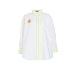 In collaboration with Chupa Chups, this shirt is adorned by a stripes motif from the collar and extends gracefully down the front buttons placket. At the heart of the shirt lies a Chupa Chups logo flower patch, proudly displayed on the right chest. With a high-low hem, pointy collar, and cuffed button sleeves, this shirt is designed to be a fun and fashionable addition to your wardrobe.