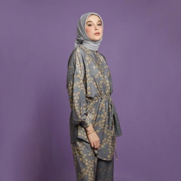 Atasan drop-shoulder yang dibuat dari bahan crepe lembut dan dilengkapi dengan kancing depan tersembunyi, tali pinggang yang dapat disesuaikan untuk gaya, dan hem asimetris.