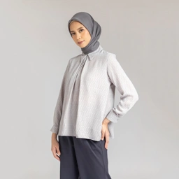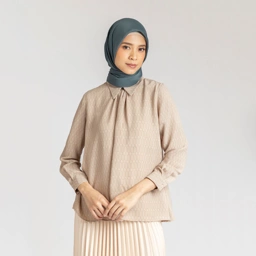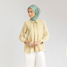 Kemeja berkerah yang menggunakan bahan krep halus. Menampilkan detail kerut di leher, ujung lengan yang dapat disesuaikan, dan lengan berlipit.