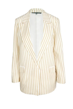 This chic blazer features a striped pattern that adds a playful and contemporary touch. It has an open front design that allows for effortless layering. Featuring a notch lapel, this blazer exudes classic elegance, while the flap pockets add a functional and stylish element.