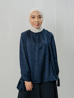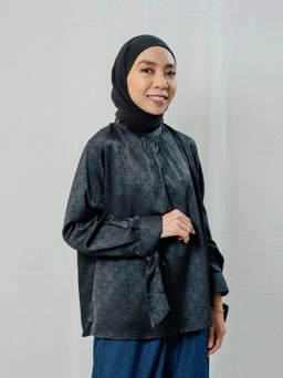 Atasan longgar dalam warna netral dan bahan satin yang mewah. Detail kerah dan manset berpita menambah dimensi pada kreasi jacquard Kami. Mono Curve.