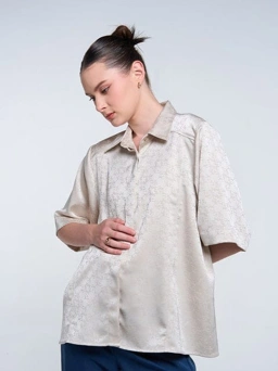 Bahan jacquard khas Kami. tampil menonjol pada Asha Top, dengan fit longgar yang memberi kesan modern pada item klasik kemeja kancing lengan pendek.