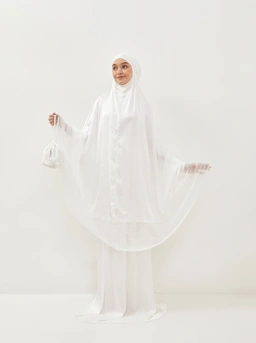 Simple nan mewah, Sateen Lace Prayer Set hadir dengan bahan satin polos yang ringan dan aksen renda cantik. Hadir dengan pouch yang praktis untuk dibawa berpergian.