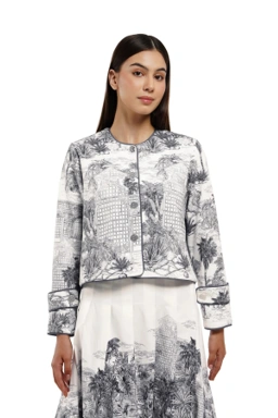 This crop outer presents the elegance of toile de jouy artistry, showcasing a delicate glasshouse scenery that reflects timeless sophistication. Designed in a cropped silhouette, this outer features front opening buttons, binding detailing along the edges, and cuffs finished with an embroidered logo.