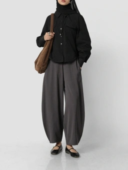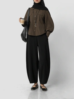 2. Terbuat dari Heavy Crepe bertekstur grainy halus, lebih berbobot dibanding crepe biasa sehingga “jatuh” kainnya lebih elegan, tidak mudah kusut dan tidak menerawang. Bahan terbaik untuk menghasilkan siluet khas Osaka Pants dengan bentuk yang tegas namun tetap fleksibel.