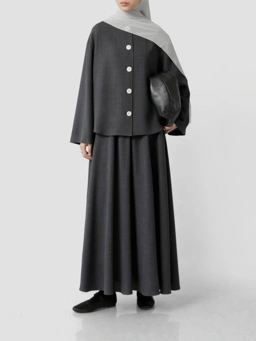 1. Atasan loose fit tanpa kerah dengan lengan lebar dan detail kancing yang unik.