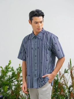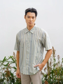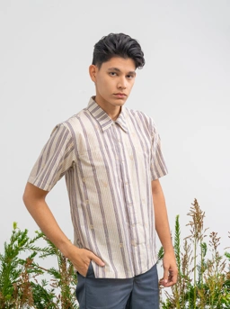 Zayn Koko dengan kombinasi stripes + bordir Kami yang unik, cocok untuk gaya Raya yang lebih santai. Bahan kantun memberi kenyamanan, dan model saku ganda di sisi memberi detail playful.
